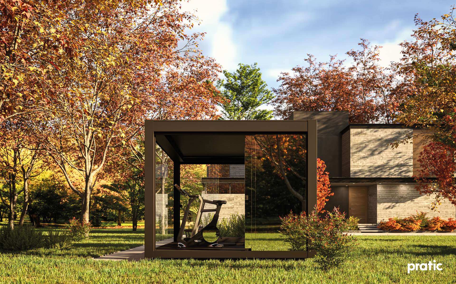 Die Pergola Serie CONNECT schafft einen exklusiven Raum aus Spiegelwänden, die die Schönheit der Umgebung wiedergeben. Die Lamellen dieser Pergola drehen sich um bis zu 140 Grad, wirken bioklimatisch und lassen sich auf Wunsch auffahren, so dass ein offenes Dach entsteht.